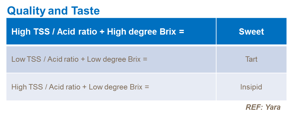 Aroma e sapore sono legati al livello di solidi solubili totali (TSS, Total Soluble Solids), al livello di acidità e alla quantità di sapori aromatici o amari presenti nel frutto. Solitamente il contenuto di solidi solubili totali viene misurato a partire dalla determinazione del Brix del frutto.