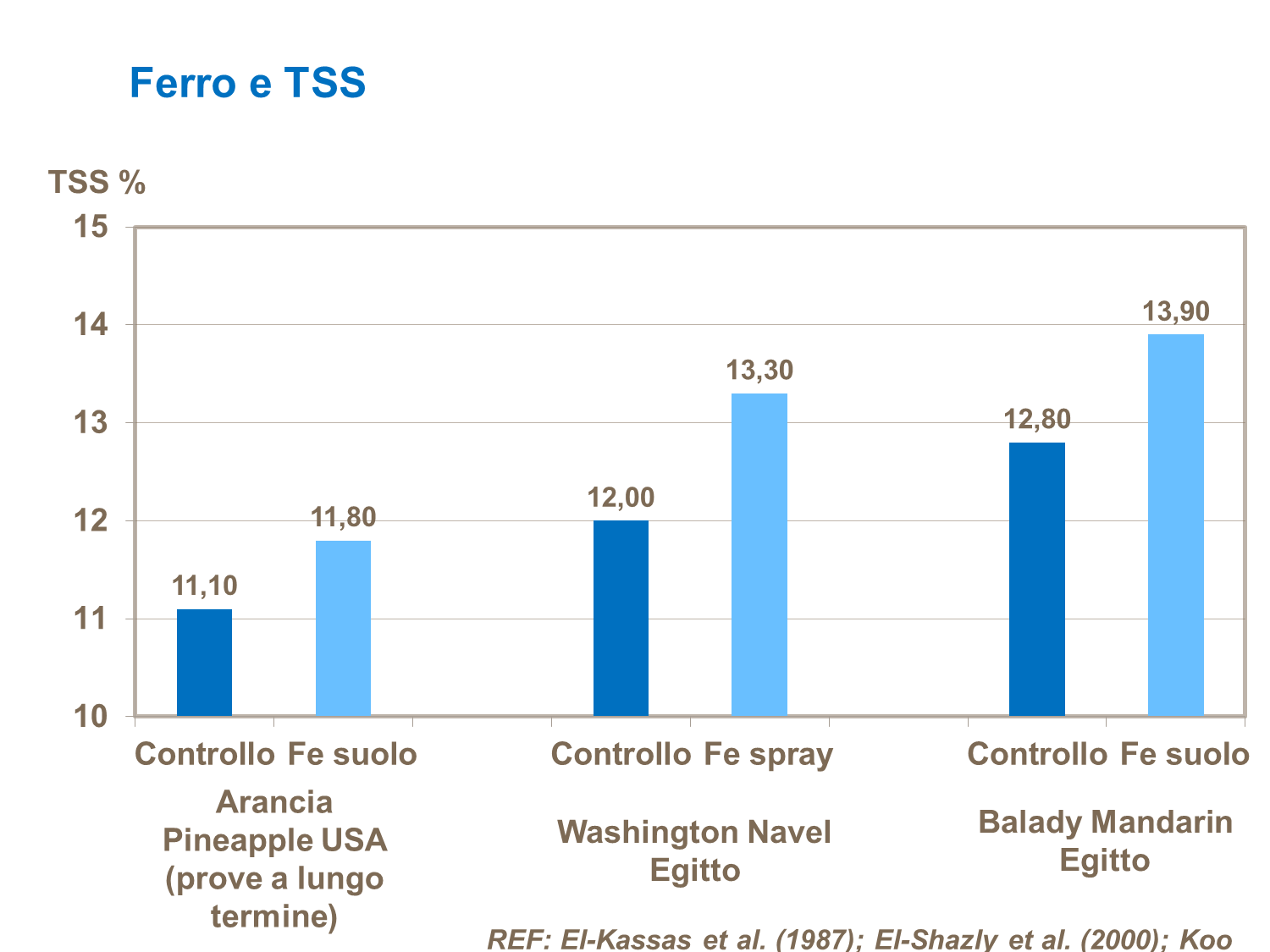 L'uso del ferro aumenta in maniera efficace il livello di zuccheri presenti nei frutti. Nei casi di carenza di ferro, gli studi mostrano un aumento nelle arance Pineapple, nei Washington Navel e nei mandarini Balady.
