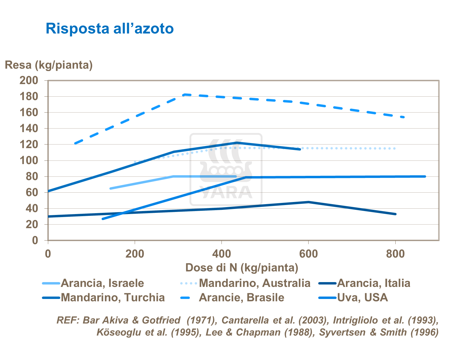 L'azoto è un componente fondamentale di enzimi, vitamine, clorofilla e di altri costituenti cellulari che sono essenziali per la crescita e lo sviluppo delle colture. Pertanto, l'azoto è uno dei nutrienti più importanti per ottenere rese elevate nella produzione di agrumi.