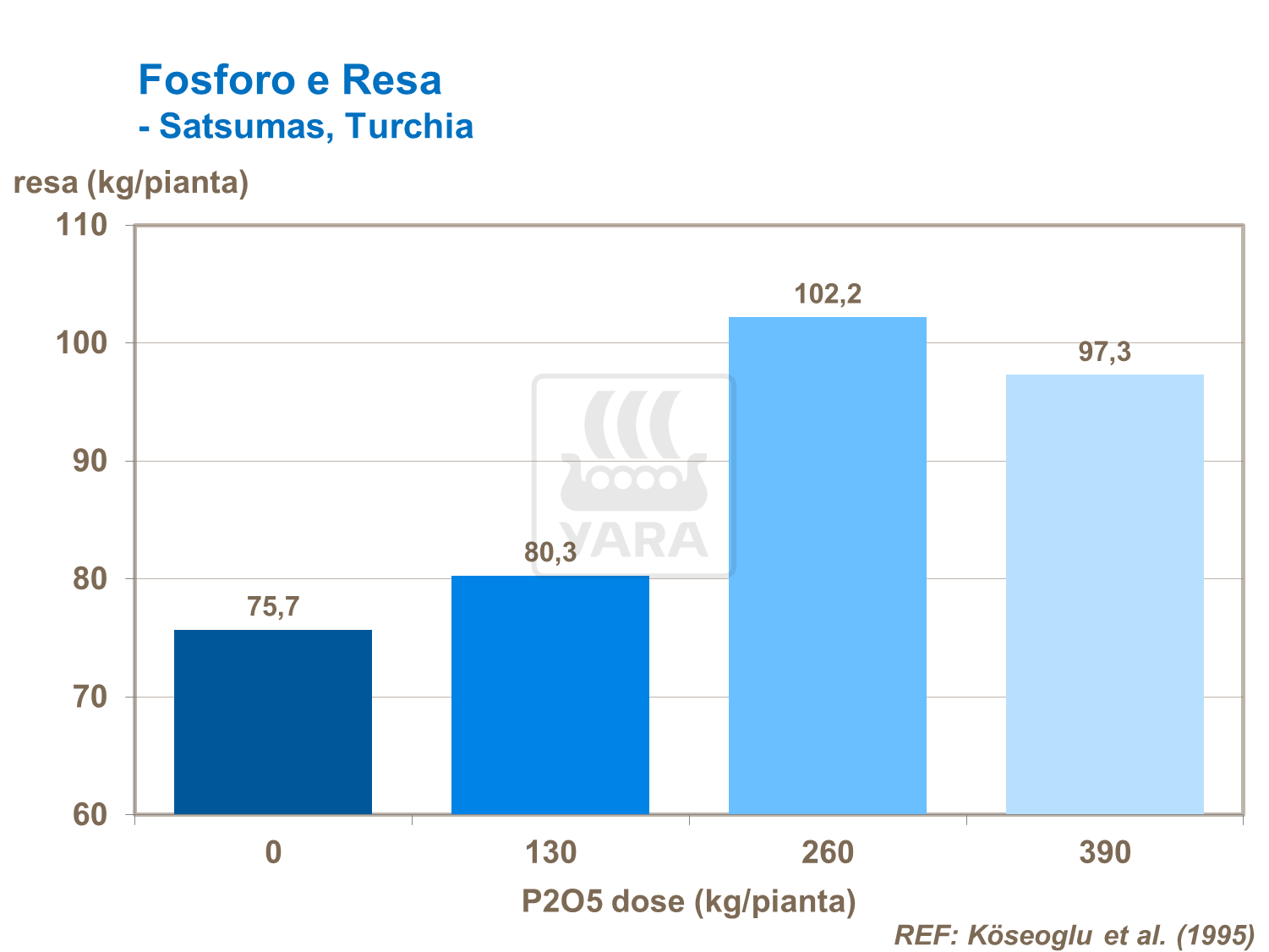 Le prove su arance satsuma in Turchia mostrano che la dose di 260g P2O5/pianta comporta ottime rese su un periodo di 4 anni. Per le piante adulte il momento dell'applicazione non è critico. Il fertilizzante in genere è applicato all'inizio o alla fine della stagione. L'applicazione regolare tramite fertirrigazione può aumentare l'efficienza dell'assorbimento di Fosforo e al tempo stesso assicurare un efficiente utilizzo degli altri nutrienti.