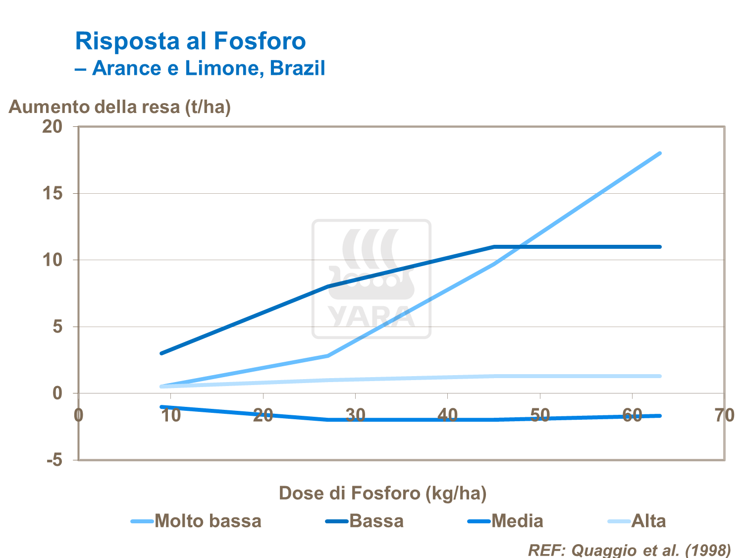 I suoli con bassi valori di fosforo hanno bisogno di applicazioni di Fosforo, come mostrano i trials in Brasile su arance e limoni. L'assorbimento di Fosforo si ha per tutto il periodo di crescita, dopo la fioritura e fino a maturità del frutto. Una buona disponibilità è importante durante i periodi di crescita attiva delle radici, ad esempio in primavera.