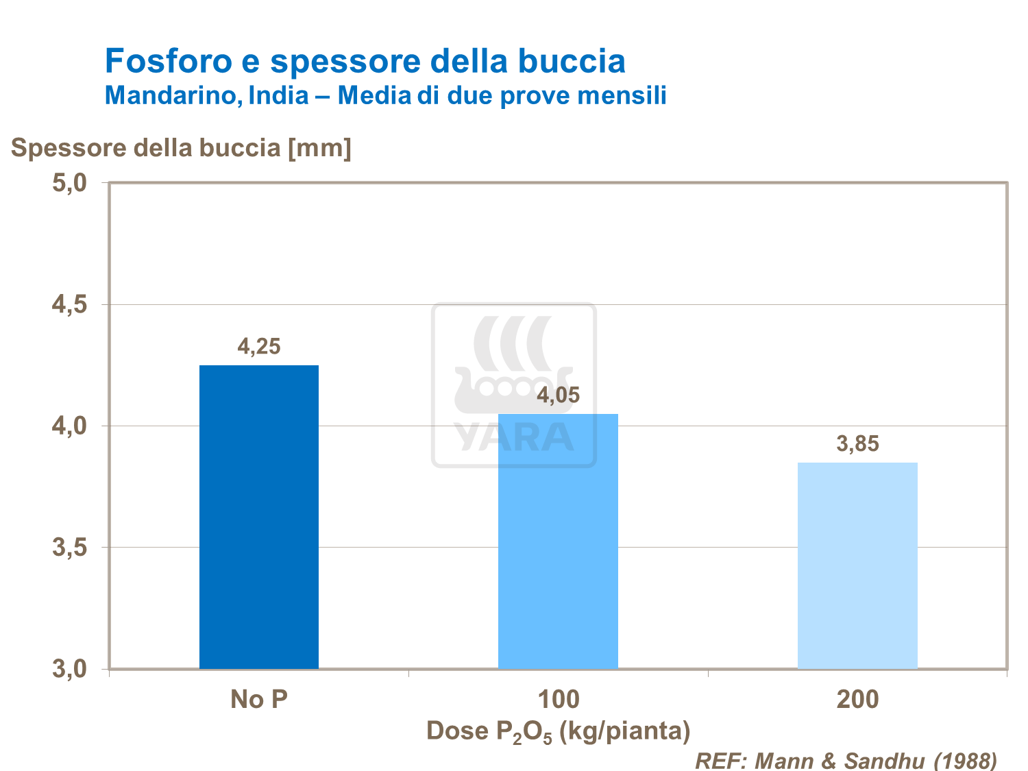 Un sovradosaggio di Fosforo può ridurre lo spessore della buccia, come mostrano gli studi sui mandarini in India. Perciò è importante mantenere il giusto bilanciamento tra Azoto e Fosforo.