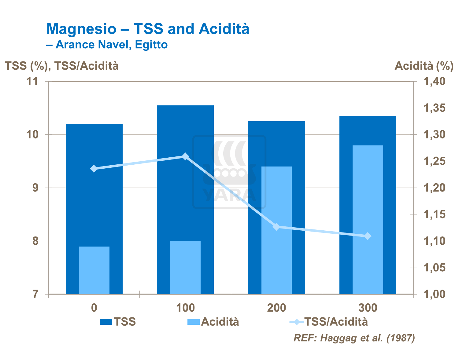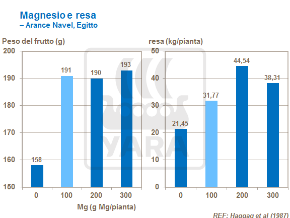 È provato che le applicazioni di Magnesio accrescano la resa, come mostrato da trials in Egitto con le arance navel.