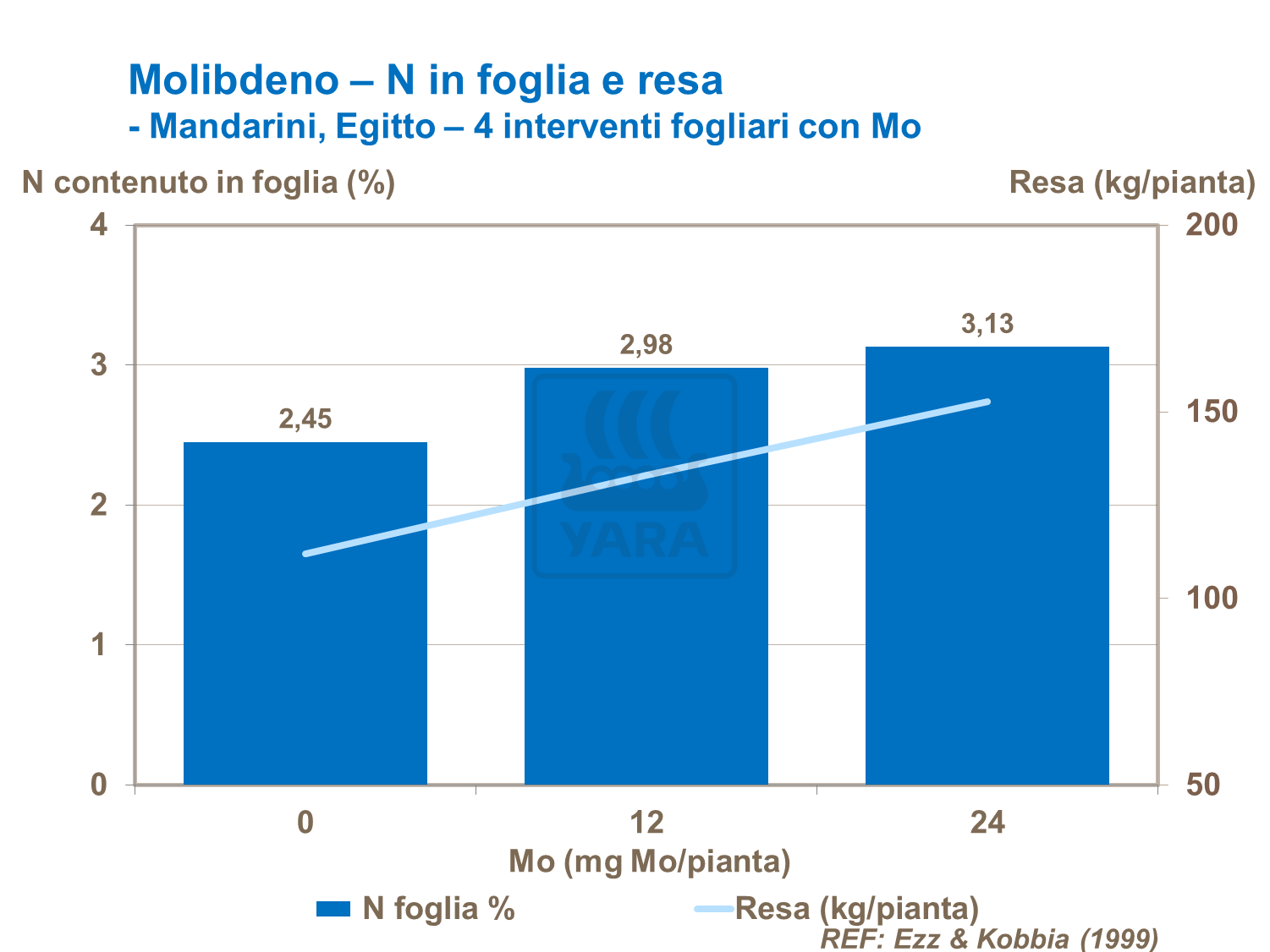 Nei trial portati avanti in Egitto, l'attività della nitrato riduttasi aumenta con l'aumentare del Molibdeno. È stato dimostrato come 6mg/pianta di Molibdeno aumentino la resa dei mandarini del 44% aumentando il contenuto di Azoto della foglia.
