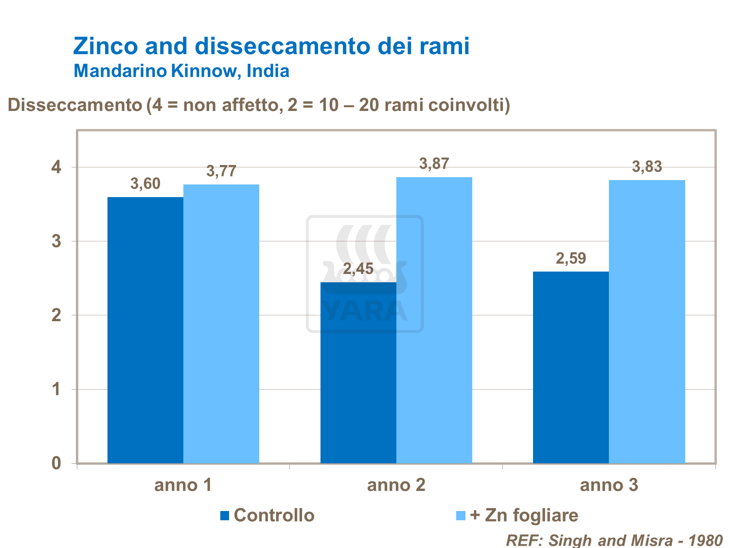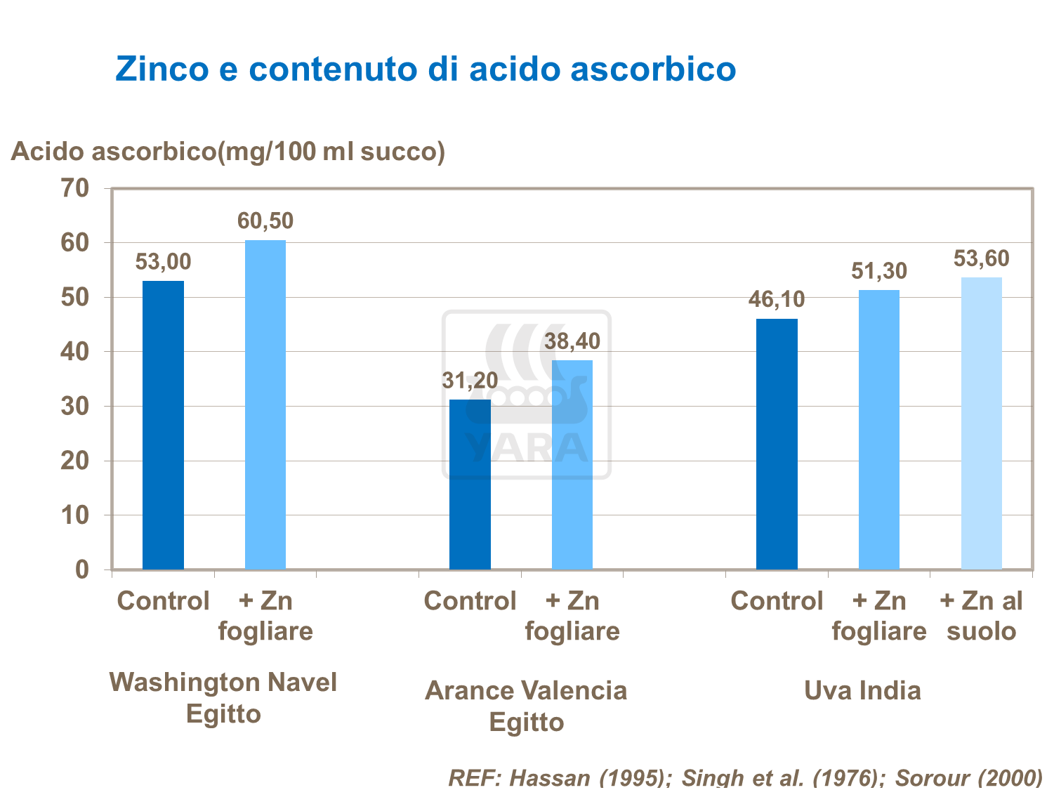 La carenza di Zinco riduce la crescita vegetativa e dunque il potenziale di resa. Bassi livelli di Zinco riducono il numero dei frutti per pianta, come mostrano le prove in Egitto sulle arance Navel.