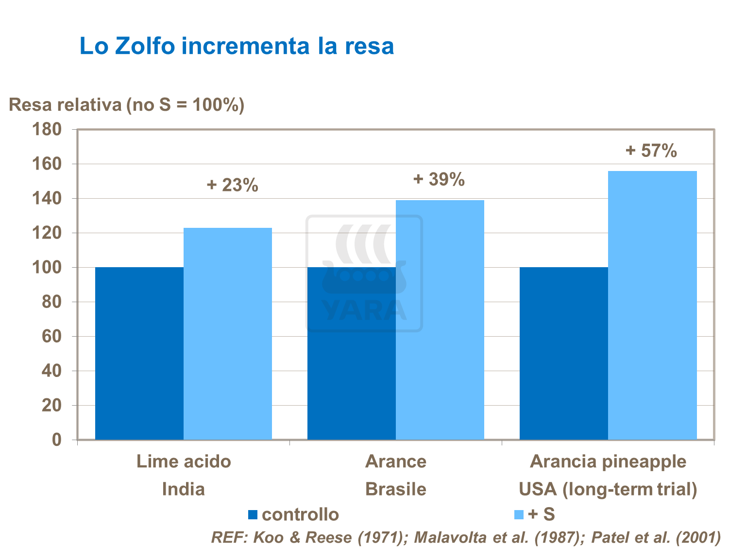 Nella produzione di agrumi sono necessari livelli relativamente bassi di zolfo, in quanto il consumo di tale sostanza è contenuto. Tuttavia, quando lo zolfo scarseggia ciò ha un impatto diretto sulla resa degli agrumi. Nei fertilizzanti NP o NPK, nelle formulazioni di micronutrienti e nell'acqua di irrigazione spesso non c'è zolfo sufficiente a soddisfare le esigenze delle colture.