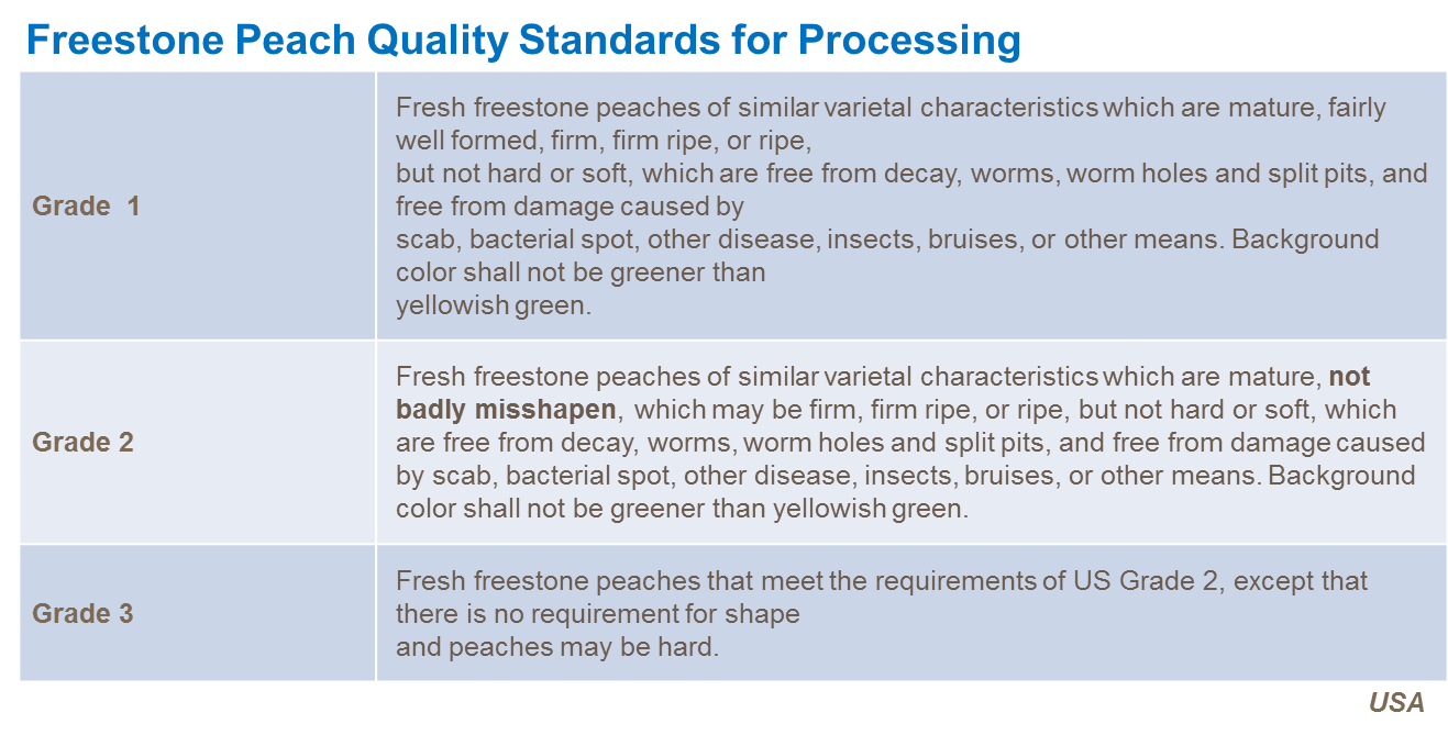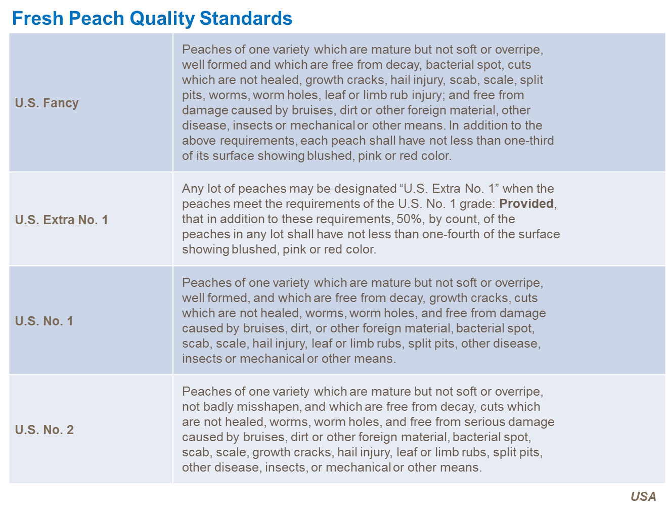 Le pesche fresche devono essere esenti da polvere, malattie e ammaccature. La buccia deve essere intatta e presentarsi bene, con una buona peluria. Gli Stati Uniti hanno quattro standard per le pesche fresche. Anche le pesche utilizzate per l'inscatolamento, il congelamento o per ottenere polpa devono essere prive di difetti. La grandezza può essere un ulteriore fattore, perché se il frutto ha dimensioni ridotte risulta difficile da pelare prima dell'inscatolamento. Gli Stati Uniti suddividono le pesche spiccagnole da lavorazione in tre diverse qualità.