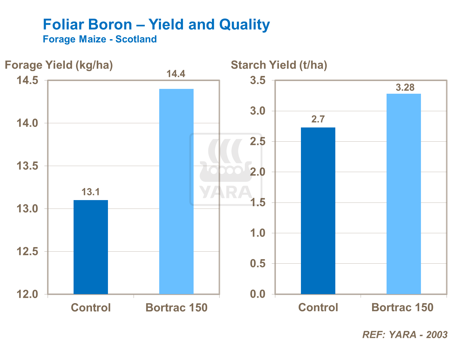 È comprovato il fatto che il boro aumenti la resa e il contenuto di amido nel mais da foraggio. Applicazioni fogliari eseguite allo stadio V5 o V6, quando vi è una significativa copertura fogliare, incrementeranno le rese nelle colture più povere.