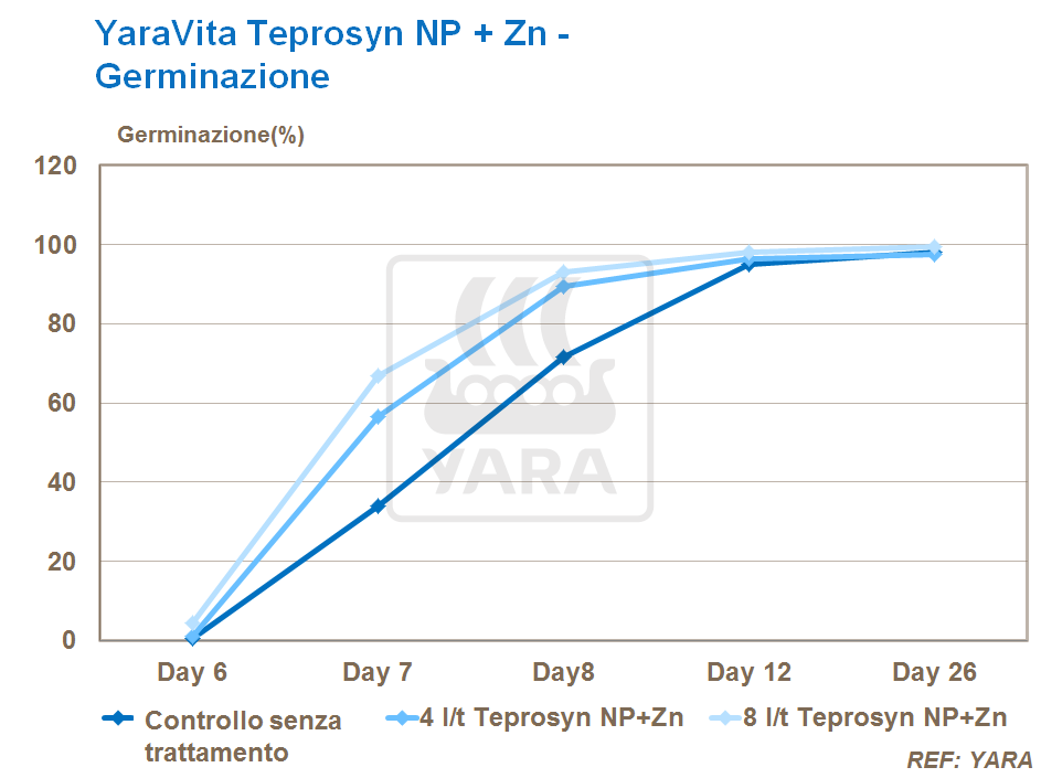 Ad esempio, sperimentazioni con YaraVita Teprosyn NP + Zn su mais hanno permesso di ottenere miglioramenti in termini di germinazione del seme, affrancamento e successiva crescita.