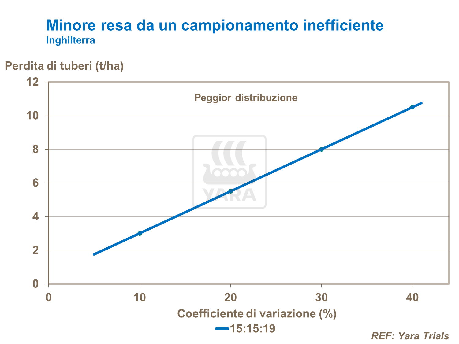 In caso di applicazione per spargimento è essenziale che la distribuzione sia uniforme. Piccole differenze di più o meno il 10% possono comportare perdite in resa fino a 1,3 t/ac. Si veda la figura seguente.