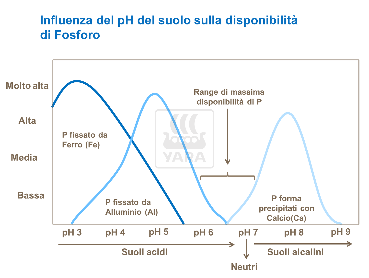 In questo grafico è rappresentata l'influenza esercitata dal pH del terreno sulla disponibilità di fosforo a seguito della precipitazione ad opera del calcio in condizioni di pH elevato e della fissazione a opera del ferro e dell'alluminio con pH basso.
