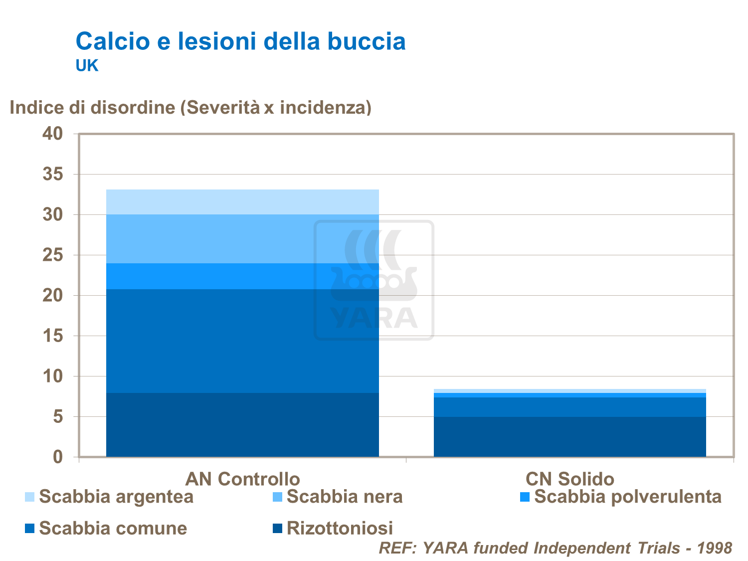 Il calcio rafforza la buccia e assicura una maggiore resistenza a numerose malattie, quali rizottoniosi, scabbia argentea, scabbia polverulenta e comune. Queste sperimentazioni indipendenti condotte nel Regno Unito dimostrano una riduzione delle lesioni della buccia causate da varie alterazioni a seguito del trattamento con nitrato di calcio.