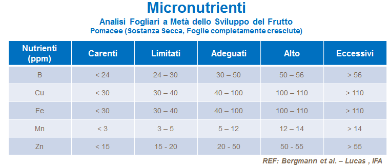 Nonostante le tabelle riportino valori considerati efficaci per una crescita ottimale, non considerano la capacità dell'albero di riciclare i nutrienti per i frutti. Ad esempio, anche se i livelli tissutali di Ca sono sufficienti, il frutto potrebbe esserne carente e avere problemi qualitativi durante la conservazione. Per prevenire possibili squilibri dei nutrienti che potrebbero causare problemi in fase di conservazione si utilizza con sempre maggiore frequenza l'analisi dei frutticini di circa 25-30 mm di diametro. Questa analisi consente di effettuare somministrazioni mirate a frutti e foglie.
