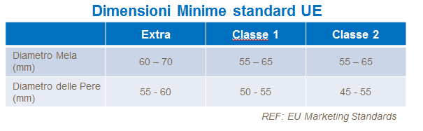 L'Unione Europea ha suddiviso mele e pere in tre classi: "extra", "I" e "II". I frutti vengono classificati in base a pezzatura, forma, colore, assenza di difetti, lesioni e malattie.
