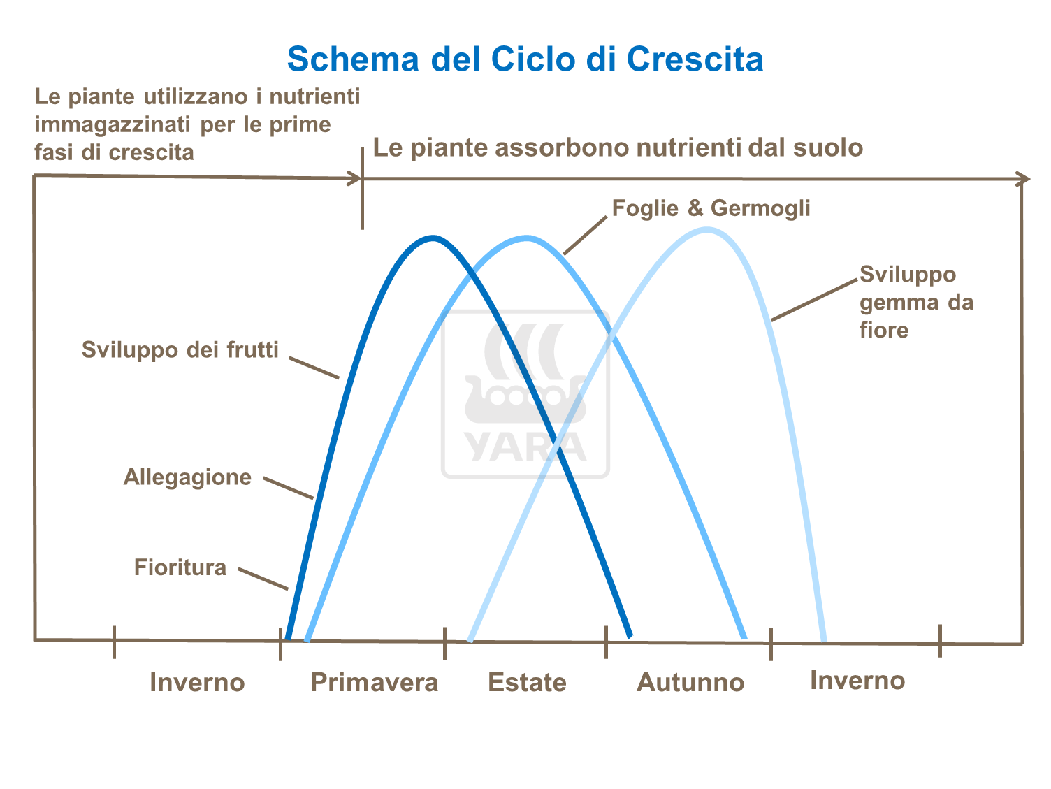 La maggior parte dei nutrienti viene conservata e trattenuta come riserva nei germogli, nella corteccia e nelle radici dell'albero. Dopo l'inverno vengono nuovamente mobilizzati per alimentare la crescita della pianta, la fioritura, la formazione dei frutti e la crescita. Una quantità significativa di nutrienti assorbiti dall'albero viene inoltre riciclata tramite il terreno a seguito di potatura annuale, diradamento dei frutti e caduta delle foglie.