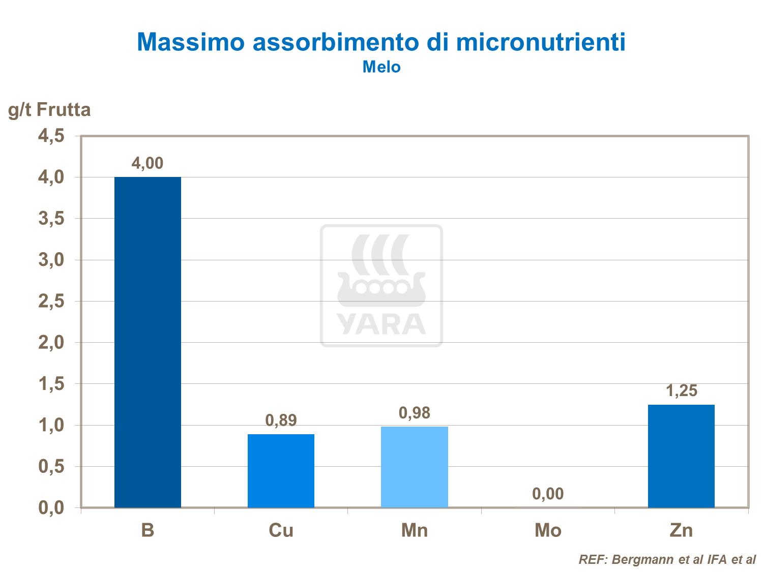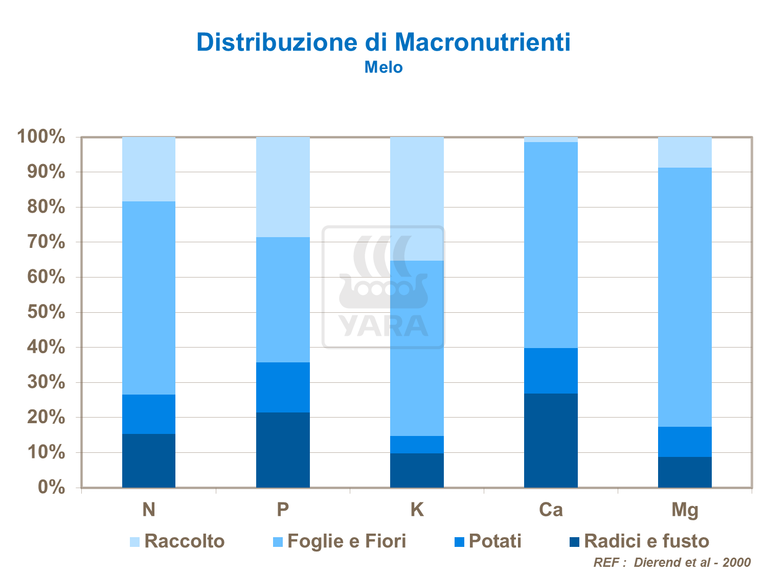 Calcio, potassio e azoto sono i macronutrienti più importanti per i frutteti di valore economico. L'albero necessita di grandi quantità di calcio per crescere e mantenersi sano. Anche se solo una piccola quantità di calcio raggiunge il frutto, questa bassa concentrazione è essenziale e importante per ridurre i problemi qualitativi durante la conservazione.