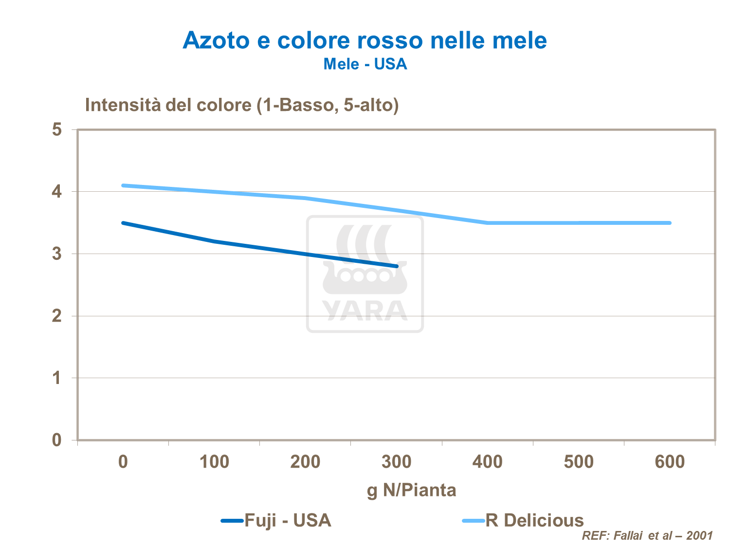 Eccessi nell'utilizzo di Azoto possono anche ridurre l'intensita di colorazione rossa delle mele, come mostrano studi americani. Detto ciò questo può risultare un fattore positivo nel migliorare il verde delle mele riducendo al minimo la colorazione rossa.
