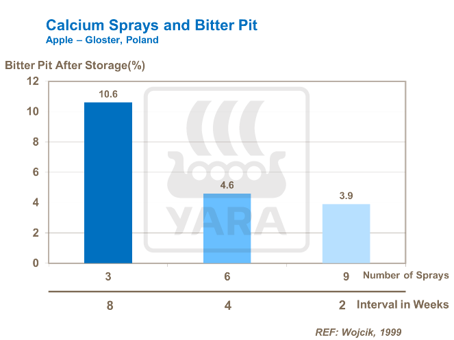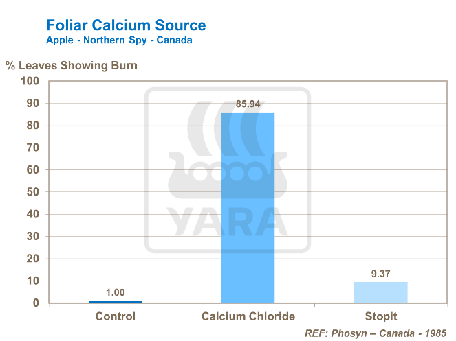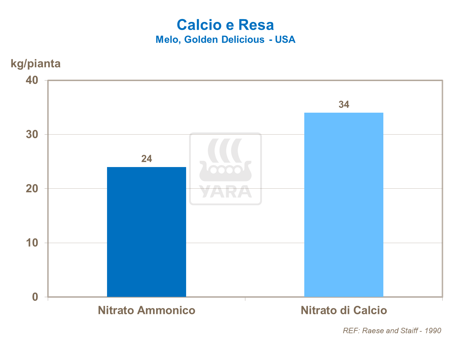 Applicazioni di Nitrato di Calcio al suolo in primavera mostrano milgiori risultati incrementando la resa colturale meglio che utilizzando nitrato ammonico, come si puo' vedere nella figura (prove con mele Golden Delicius in US)