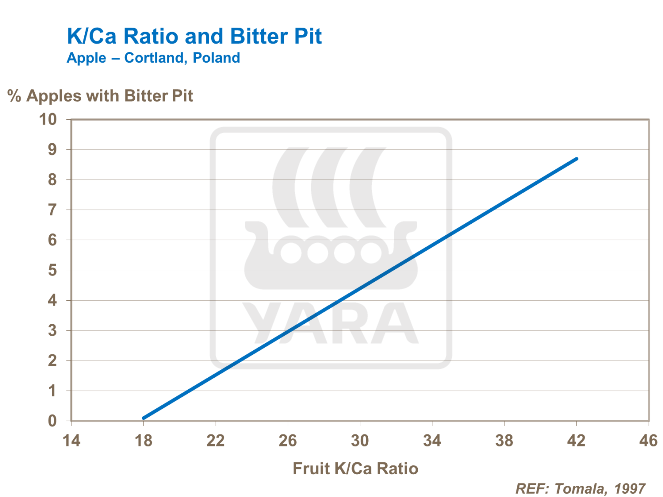 It is important that K-concentrations are in balance with other nutrients, particularly calcium, as preferential uptake of potassium over calcium will significantly reduce a range of quality characteristics. The most notable of these is bitter pit, as studies in Poland show.