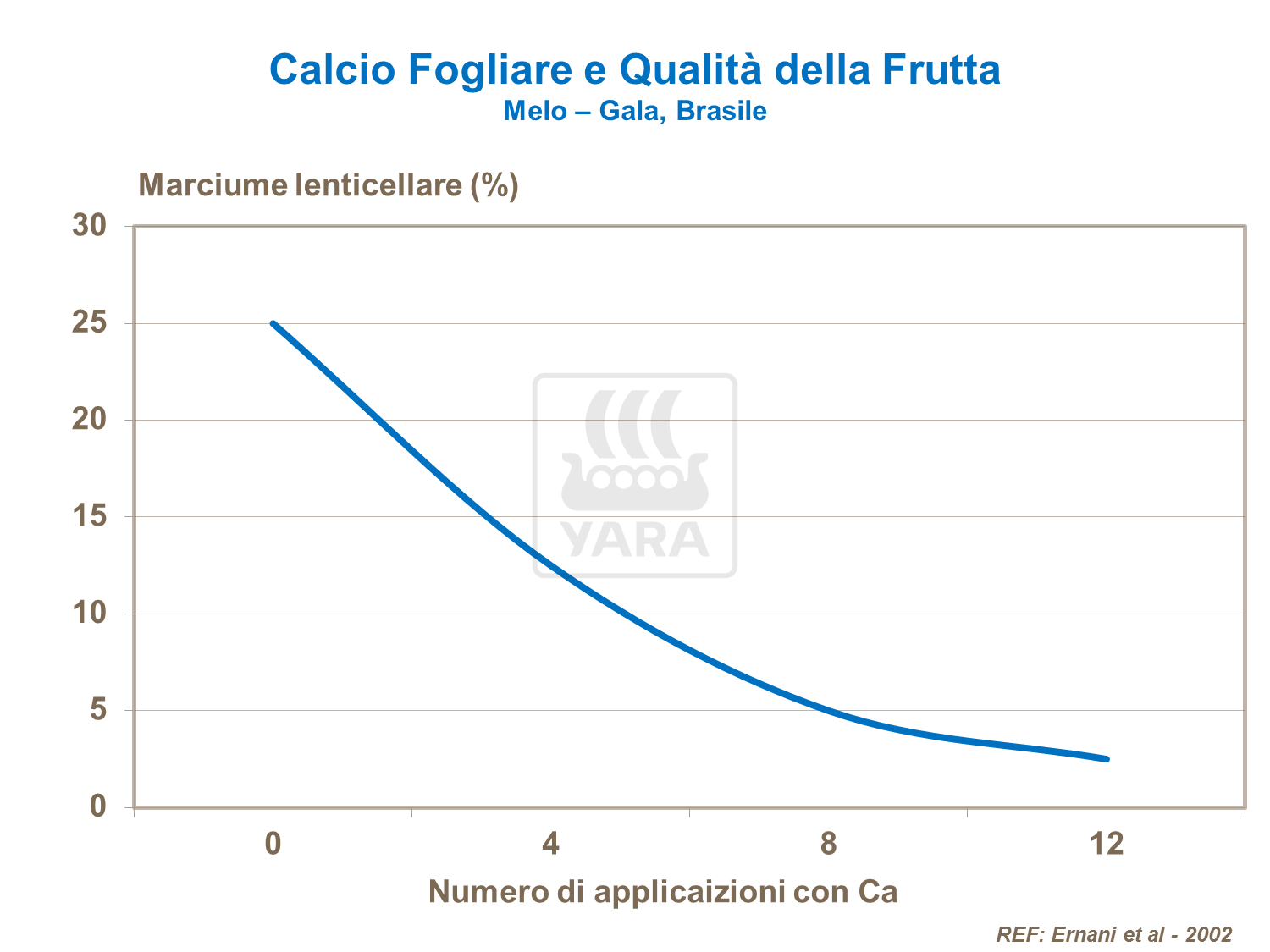 Le somministrazioni al suolo e le irrorazioni dei frutti con Calcio contribuiscono a ridurre l'incidenza del marciume lenticellare nelle pomacee. La qualità del frutto migliora proporzionalmente al numero di irrorazioni, che devono proseguire fino alla raccolta.