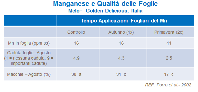 Nelle sperimentazioni il Manganese fogliare, somministrato almeno due volte nel corso della primavera, ha dimostrato di essere efficace nel ridurre la caduta delle foglie e il marciume lenticellare.