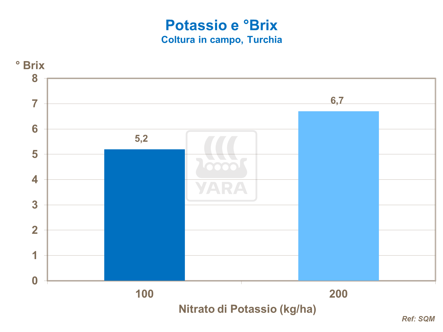 Il Potassio aumenta il contenuto di TSS nei pomodori, in quanto influisce sulla traslocazione dei nutrienti prodotti dagli organi vegetali alle bacche. Oltre a migliorare la qualità dei prodotti trasformati, questo presenta dei vantaggi in termini di miglioramentocaratteristiche organolettiche e di conservazione dei pomodori freschi.