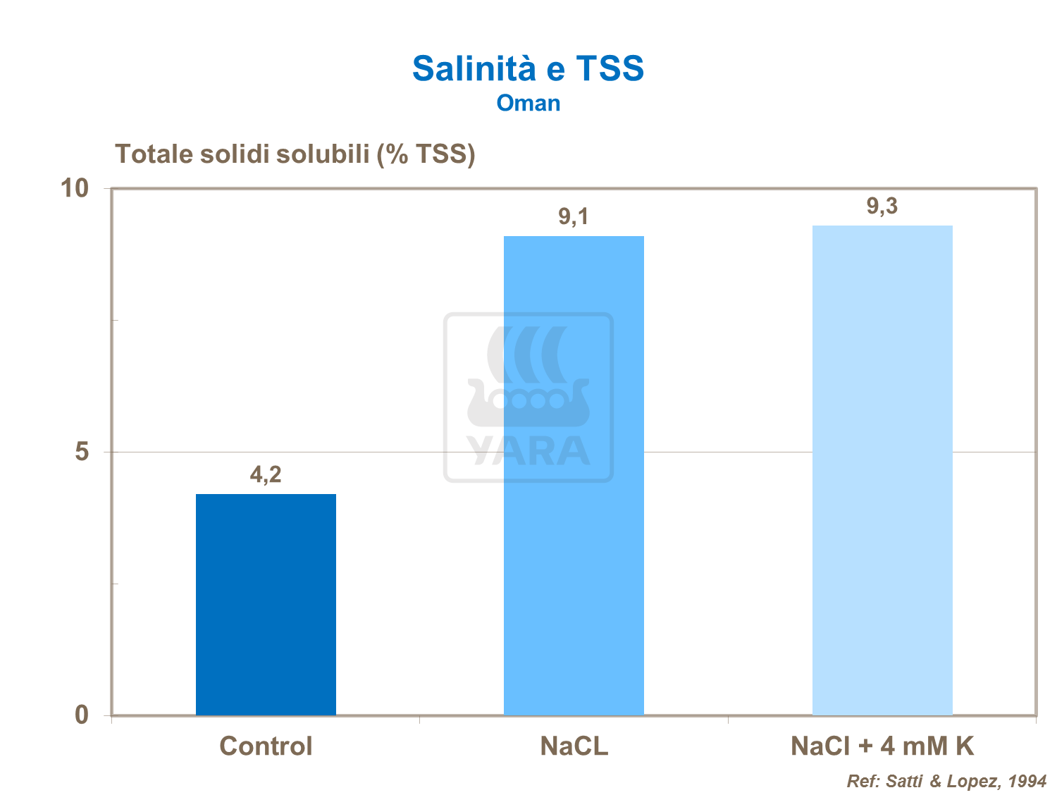 - Aumenta lo zucchero (cfr. grafico sulla salinità e TSS) nonché il contenuto di acidi della frutta, migliorandone il gusto.